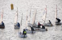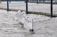 Pünktlich um 12:05 starteten 24 Seglerinnen und Segler zur ersten der beiden 25-minütigen Wettfahrten. Die Besatzungen der beiden Begleitboote - Frank, Rolf, Stefan und Thomas - mussten ob des böigen Windes einige Hilfestellungen leisten.