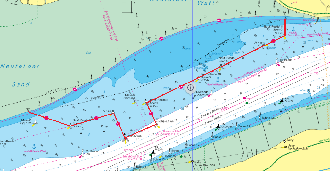 Die Bagger verbringen ihr abzuladendes Material mittels Einspülung über Schwimmrohrleitungen oder Düker in die Unterwasserablagerungsflächen. Dazu musste das Sperrgebiet vor dem Neufelder Watt nochmal erweitert werden. Die Reeden Neufeld-Ost und Neufeld-West wurden getrennt. Dazwischen wurde das vorhandene Sperrgebiet über eine Länge von etwa einer Dreiviertelseemeile bis ans Hauptfahrwasser zwischen den roten Fahrwassertonnen 52 und 54 herangeführt, südlich begrenzt durch zwei Süd-Kardinaltonnen, die schon im Fahrwasser liegen. Hier muss man rechtzeitig aufpassen. Wer bei Südwestwind von Brunsbüttel kommend elbab kreuzt, wird sich vernünftigerweise von der durchgehenden Schifffahrt nördlich freihalten, also den Raum bis zur Sperrgebietsgrenze ausnutzen. Südwärts kreuzend und in Höhe der roten Fahrwassertonne 54/Reede angekommen stellt man fest, dass es diese zurzeit nicht mehr gibt und stößt auf eine der Südkardinaltonnen schon im Fahrwasser, die eine Ecke der Ausbuchtung des Sperrgebiets markiert. Hier gilt es also herumzufahren. Wenn sich jetzt gerade ein auslaufendes Fahrzeug nähert, heißt es aufstoppen und warten, bis der Vorfahrtberechtigte vorbei ist. Wenn sich eine Schleuse entleert hatte, können mehrere Fahrzeuge dicht hintereinander kommen. Eine brenzlige Ecke, verstärkt durch den Ebbstrom, der einen in das Sperrgebiet setzt!