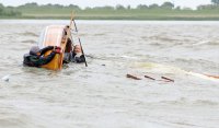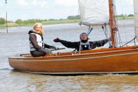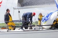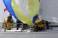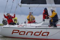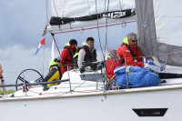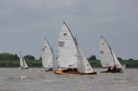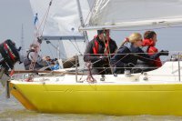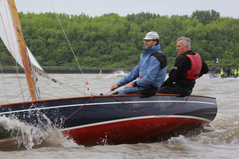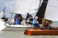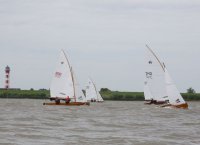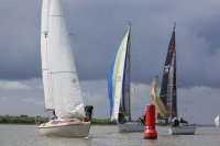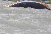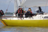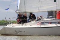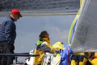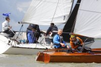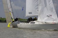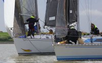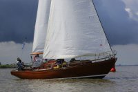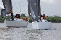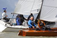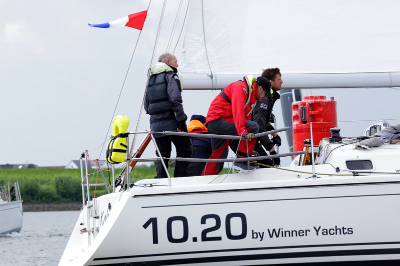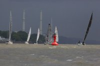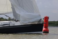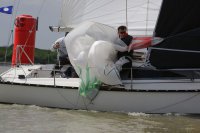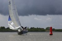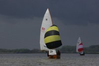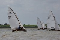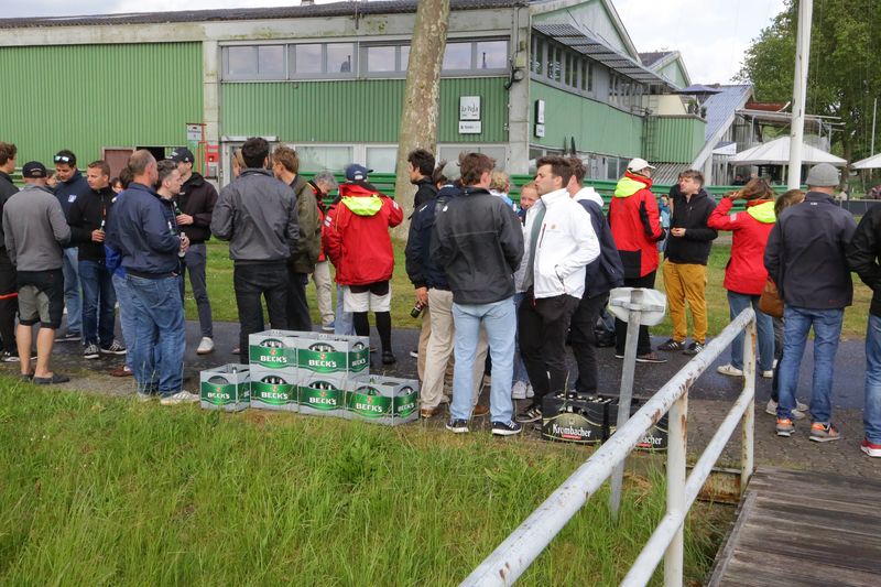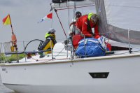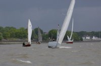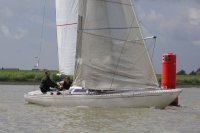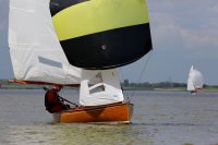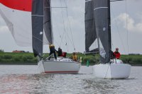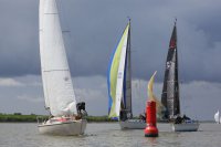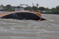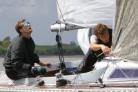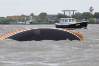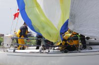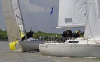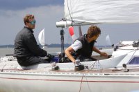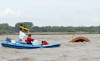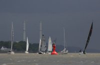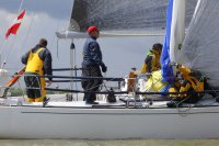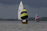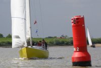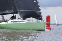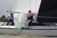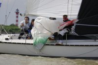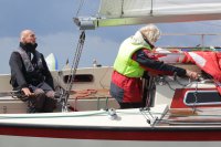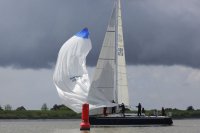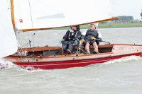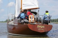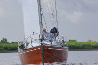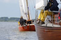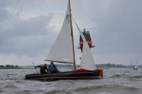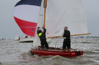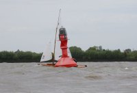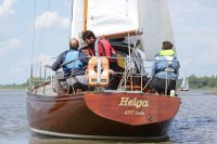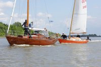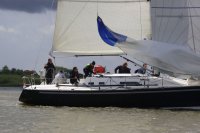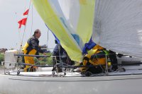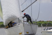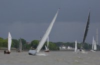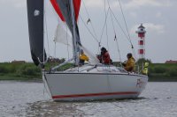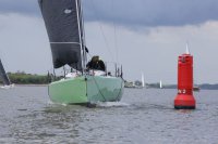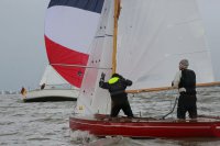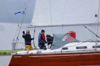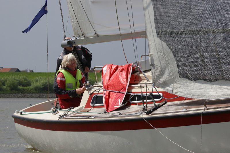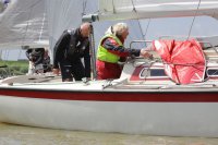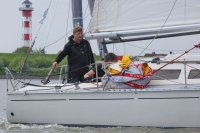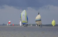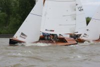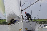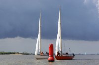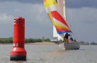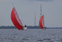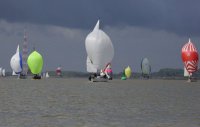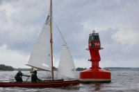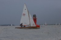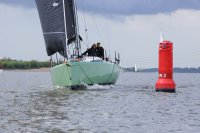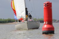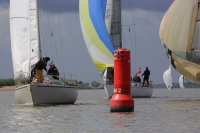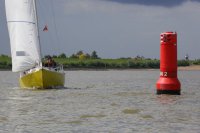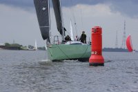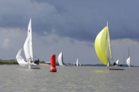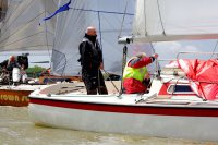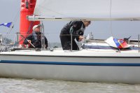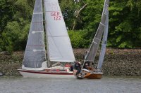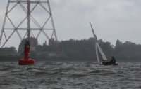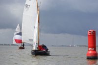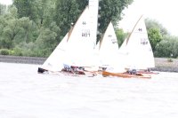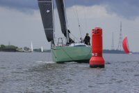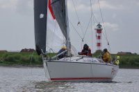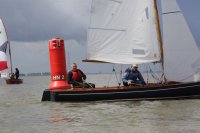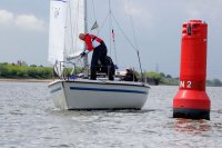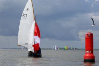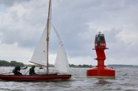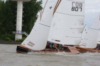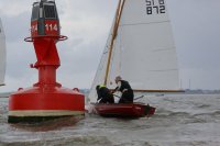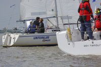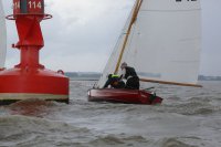 Pünktlich konnte die erste Wettfahrt gestartet werden und die Segler kreuzten elbab. Dann aber passierte es an der Wendemarke, der Tonne 116. Eine H-Jolle kenterte in einer Halse. Bedingt durch die Bergungs- und Sicherungsmaßnahmen konnte die zweite Regatta erst mit Verspätung gestartet werden. Leider schafften es die letzte Boote dann bei stark abnehmenden Winden nicht mehr, von der Wendemarke hinter Hanskalb gegen die Tide zu kreuzen und mussten die Wettfahrt abbrechen.